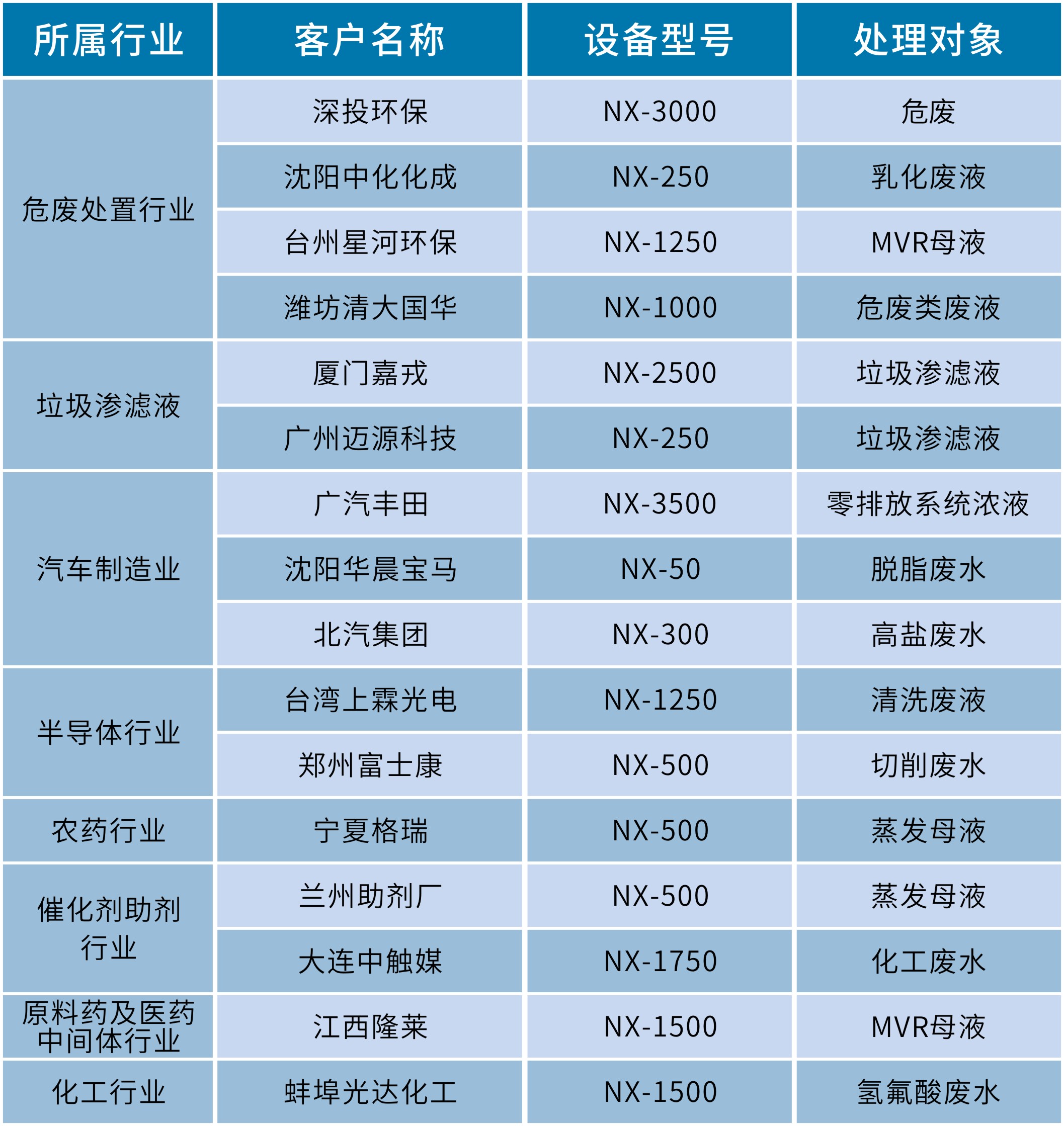 國內超過120個案例,涵蓋多個行業,包括危廢處置行業、化工行業、醫藥行業、汽車制造行業、垃圾滲濾液處理等等